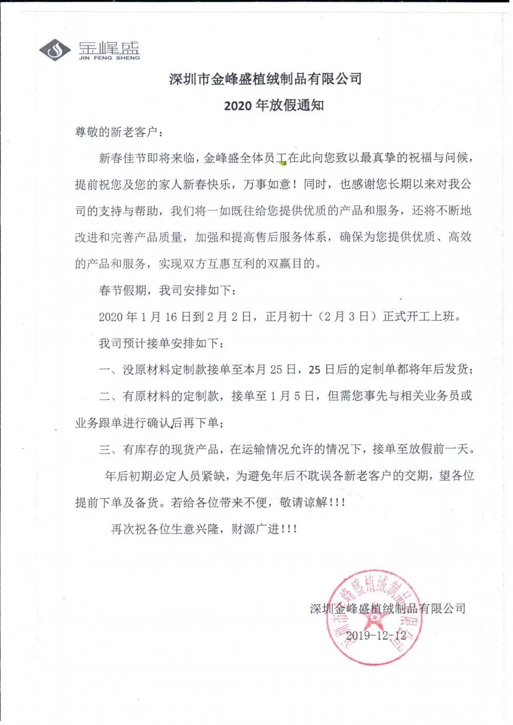 一年一度的新春佳節(jié)即將來臨,深圳市金峰盛植絨制品有限公司全體員工在此向您們致以最真摯的祝福和問候,提前祝您們新春愉快!同時,也感謝您們長期以來對我公司的支持與幫助,在接下來的日子里我們將以更優(yōu)質(zhì)的產(chǎn)品和更真誠的服務(wù)回饋廣大用戶!