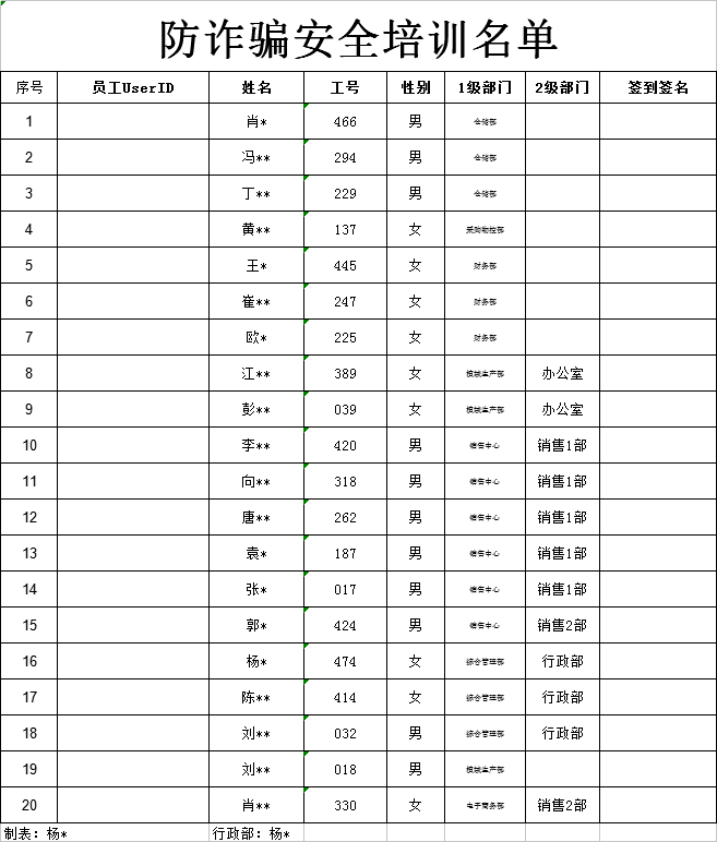 2019年8月22日上午,行政部門安排通知發(fā)出:接到工業(yè)區(qū)警務(wù)的通知,公司安排20人左右安排在公司會(huì)議室進(jìn)行反詐騙宣傳活動(dòng),培訓(xùn)時(shí)間:明天上午10:00,派出所會(huì)派人過來進(jìn)行防詐騙安全培訓(xùn),請(qǐng)大家按照如下培訓(xùn)名單,準(zhǔn)時(shí)出席,謝謝!