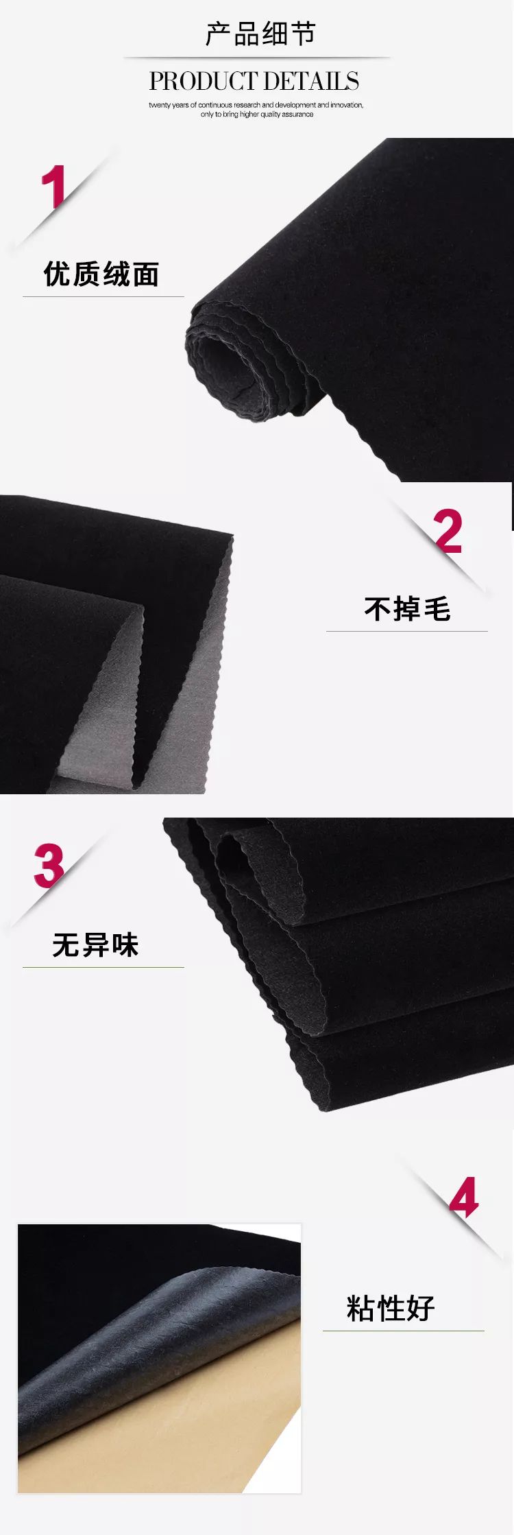 今天給您介紹的是一款黑色帶膠植絨布,是銷量最好的植絨布之一,黑色簡單大方,絨面是純黑的短毛絨,手感超柔和。