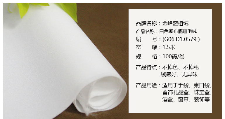 • 產品簡介:金峰盛植絨專業生產長毛植絨布、短毛植絨布、珠粒植絨布、揉紋植絨布、壓花植絨布,并可過自粘膠,還可做裁條,分切,沖型等植絨布加工。植絨布批發、植絨布價格、植絨布咨詢,都可咨詢金峰盛植絨布廠家,這里的植絨布品質看的見。這款白色綢布短毛植絨布,可根據客戶的要求進行各項環保測試,產品環保無異味。
