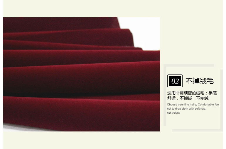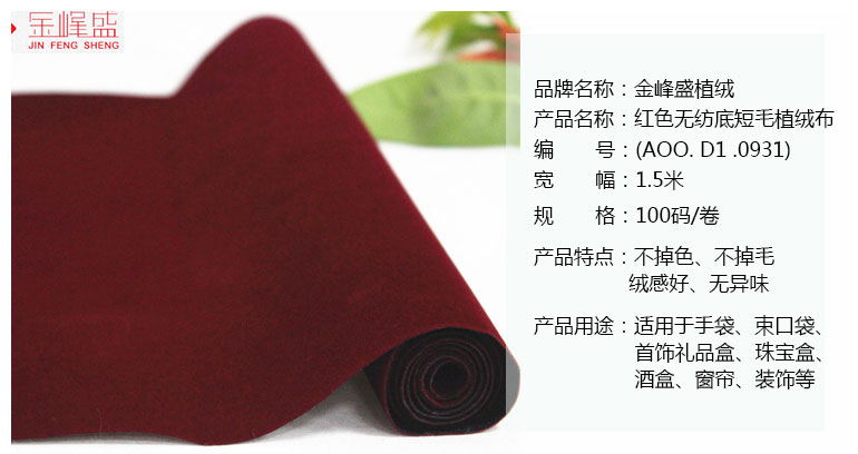 • 產品簡介:金峰盛植絨專業生產長毛植絨布、短毛植絨布、珠粒植絨布、揉紋植絨布、壓花植絨布,并可過自粘膠,還可做裁條,分切,沖型等植絨布加工。植絨布批發、植絨布價格、植絨布咨詢,都可咨詢金峰盛植絨布廠家,這里的植絨布品質看的見。這款短毛植絨布,可根據客戶的要求進行各項環保測試,產品環保無異味。