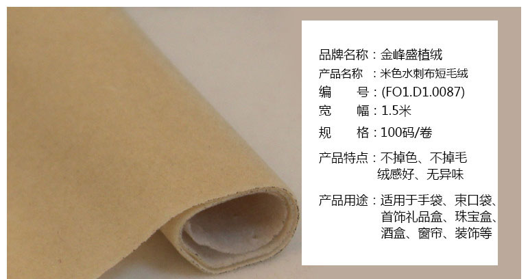 • 產品簡介:金峰盛植絨專業生產長毛植絨布、短毛植絨布、珠粒植絨布、揉紋植絨布、壓花植絨布,并可過自粘膠,還可做裁條,分切,沖型等植絨布加工。這款短毛植絨布,可根據客戶的要求進行各項環保測試,產品環保無異味。