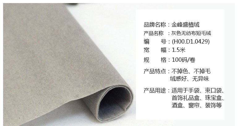 • 產品簡介:金峰盛植絨專業生產長毛植絨布、短毛植絨布、珠粒植絨布、揉紋植絨布、壓花植絨布,并可過自粘膠,還可做裁條,分切,沖型等植絨布加工。植絨布批發、植絨布價格、植絨布咨詢,都可咨詢金峰盛植絨布廠家,這里的植絨布品質看的見。這款短毛植絨布,可根據客戶的要求進行各項環保測試,產品環保無異味。