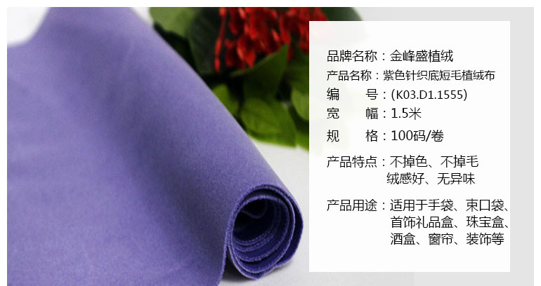 - 產(chǎn)品簡介:金峰盛植絨專業(yè)生產(chǎn)長毛植絨布、短毛植絨布、珠粒植絨布、揉紋植絨布、壓花植絨布,并可過自粘膠,還可做裁條,分切,沖型等植絨布加工。植絨布批發(fā)、植絨布價格、植絨布咨詢,都可咨詢金峰盛植絨布廠家,這里的植絨布品質(zhì)看的見。這款針織底短毛植絨布,可用于:手袋、包裝袋、化妝品袋、高檔禮品包裝盒、裝飾布、攝影布。可根據(jù)客戶的要求進(jìn)行各項(xiàng)環(huán)保測試,產(chǎn)品環(huán)保無異味。
