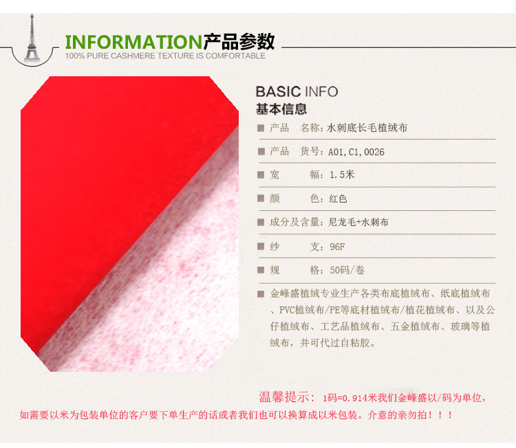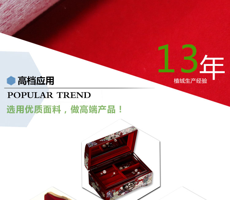 • 產品簡介:金峰盛植絨專業生產長毛植絨布、短毛植絨布、珠粒植絨布、揉紋植絨布、壓花植絨布,并可過自粘膠,還可做裁條,分切,沖型等植絨布加工。這款長毛植絨布,可根據客戶的要求進行各項環保測試,產品環保無異味。