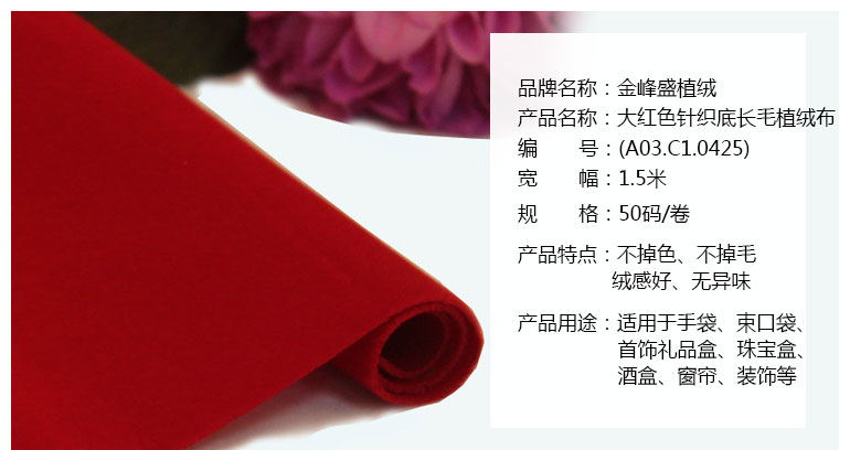 • 產(chǎn)品簡介:金峰盛植絨專業(yè)生產(chǎn)長毛植絨布、短毛植絨布、珠粒植絨布、揉紋植絨布、壓花植絨布,并可過自粘膠,還可做裁條,分切,沖型等植絨布加工。這款長毛植絨布,可根據(jù)客戶的要求進(jìn)行各項環(huán)保測試,產(chǎn)品環(huán)保無異味。