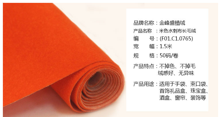 • 產品簡介:金峰盛植絨專業生產長毛植絨布、短毛植絨布、珠粒植絨布、揉紋植絨布、壓花植絨布,并可過自粘膠,還可做裁條,分切,沖型等植絨布加工。這款長毛植絨布,可根據客戶的要求進行各項環保測試,產品環保無異味。