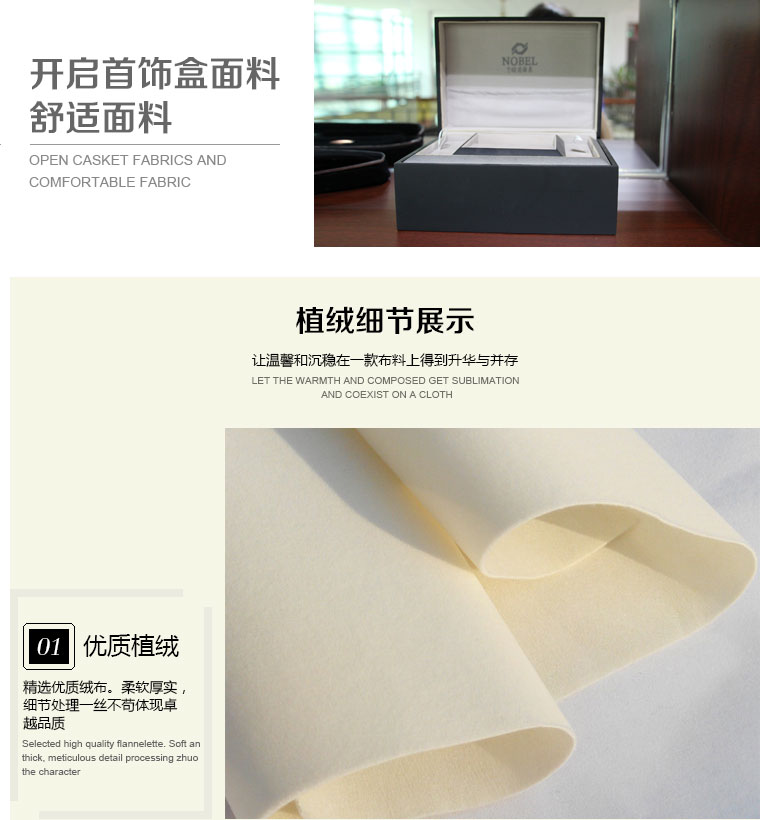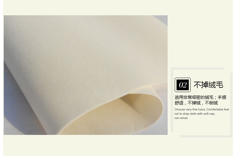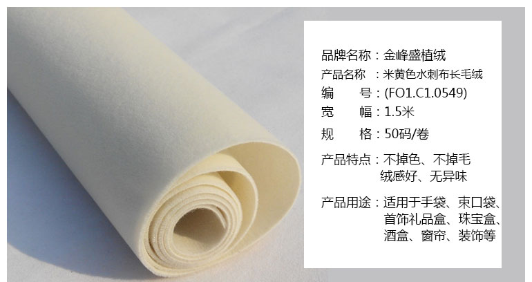 • 產品簡介:產品名稱:米色水刺長毛植絨布(F1-C0549) 顏色:米色 成分及含量:米色尼絨毛+水刺布 紗織:96F 規格:100碼/卷 用途:適用于家具、首飾禮品盒,煙酒盒,相框等。 產品優勢:立體感強、顏色鮮艷、手感柔和、豪華高貴、形象逼真、無毒無味、保溫防潮、不脫絨、耐摩擦、平整無隙。 金峰盛植絨專業生產各類布底植絨布、紙底植絨布、PVC植絨布/PE等底材植絨布/植花植絨布、以及公仔植絨布、工藝品植絨布、五金植絨布、玻璃等植絨布,并可代過自粘膠。