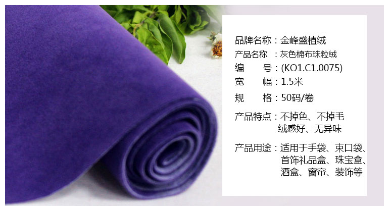 • 產品簡介:金峰盛植絨專業生產長毛植絨布、短毛植絨布、珠粒植絨布、揉紋植絨布、壓花植絨布,并可過自粘膠,還可做裁條,分切,沖型等植絨布加工。植絨布批發、植絨布價格、植絨布咨詢,都可咨詢金峰盛植絨布廠家,這里的植絨布品質看的見。這款長毛植絨布,可根據客戶的要求進行各項環保測試,產品環保無異味。